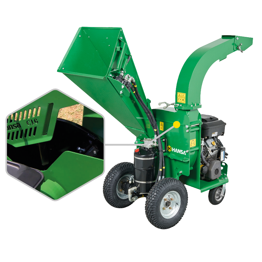 Proposée de série sur les modèles C16c, la trémie d’éjection pivotante permet à l’utilisateur d’expulser le broyat dans n’importe quelle direction.