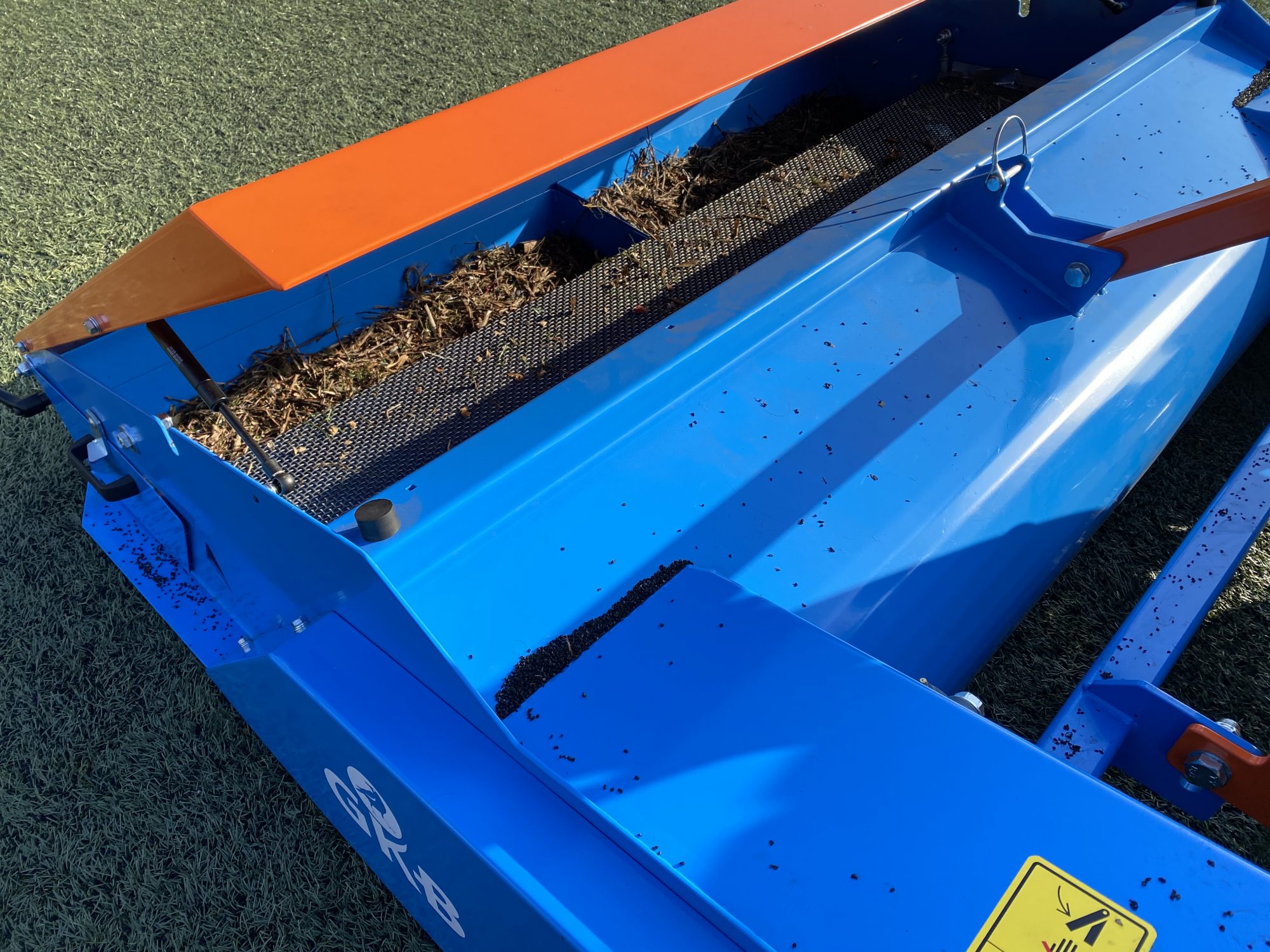 Pendant l’opération, les détritus sont acheminés sur un tapis vibrant. Les déchets sont filtrés et évacués directement dans 2 bacs récupérateurs.